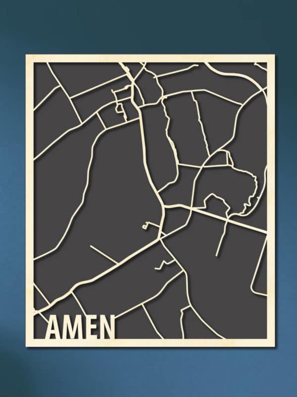 De houten stadskaart van Amen wordt door ons op bestelling gemaakt. We maken de toplaag (de wegen) van 3 mm MDF of 3 mm Berkenmultiplex. Omdat we hoog kwalitatieve wanddecoratie willen maken bevestigen we deze toplaag op een 9mm zwarte MDF achtergrond. Doordat je dan een lichte voorgrond op een donkere achtergrond krijgt kan je hem op iedere kleur muur ophangen en kan je optimaal genieten van de Citymap aan je wand. Door de dikte van 1,2cm kan de kaart ook niet kromtrekken.